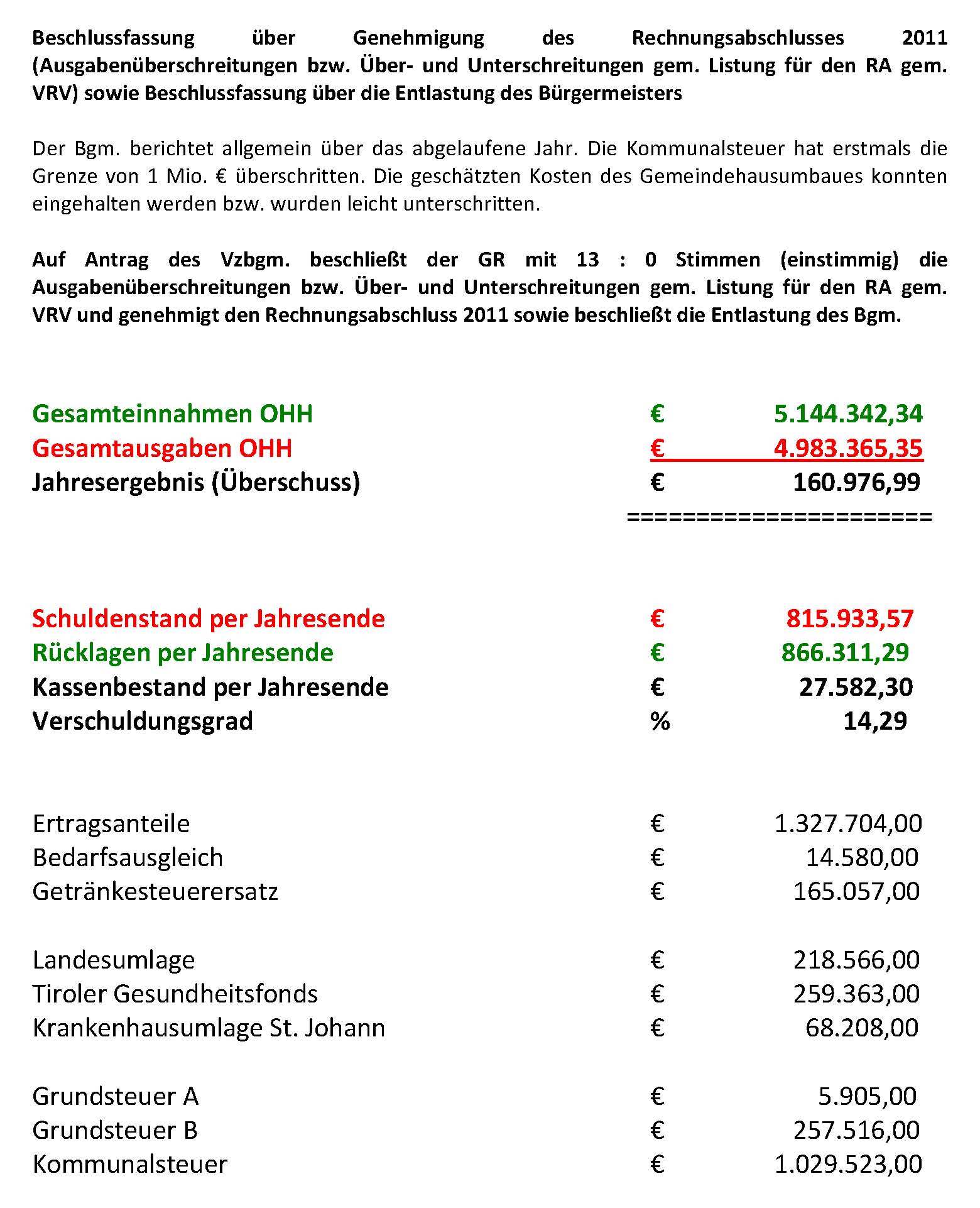 13. Beschlussfassung über Genehmigung des Rechnungsabschlusses 2011 (Ausgabenüberschreitungen bzw. Über- und Unterschreitungen gem. Listung für den RA gem. VRV) sowie Beschlussfassung über die Entlastung des Bürgermeisters