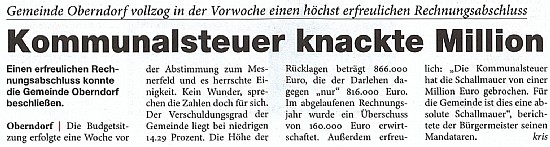D.h. im Grunde, dass Oberndorf mit März 2012 bzw. lt. Jahresbilanz 2011 SCHULDENFREI ist – d.h. wir sind im Kreise der ca. 40 österreichischen Gemeinden (von gesamt 2.357 Gemeinden), die keine Schulden mehr haben. Dazu möchte ich sie aber in einem eigenen Bericht informieren !