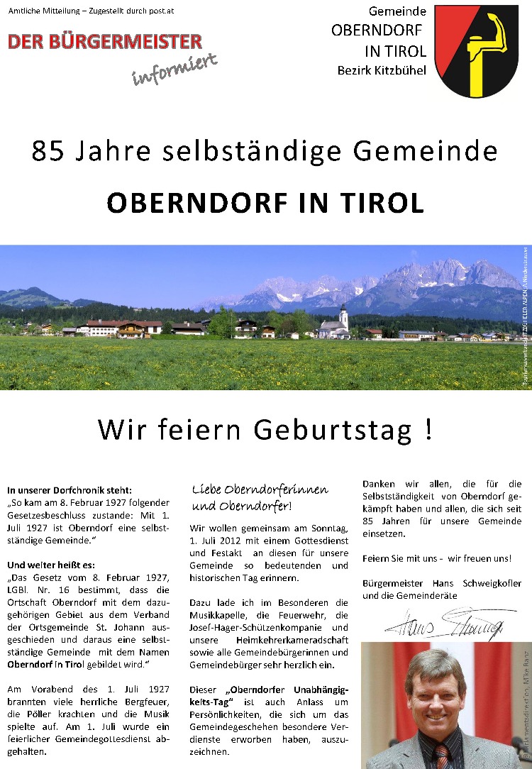 Am 16. Mai 2012 fasste der Gemeinderat den einstimmigen Beschluss, anlässlich des 20-jährigen Bürgermeisterjubiläums unseren Bürgermeister Hans Schweigkofler mit dem Ehrenring der Gemeinde Oberndorf auszuzeichnen.