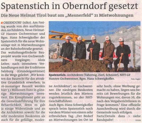 Vor kurzem fand der Spatenstich für die Mietwohnanlage Mesnerfeld an der Bahnhofstraße statt. Wie notwendig dieses Projekt ist, zeigen die vielen Bewerber/innen für eine Wohnung. Ohne dass die 21 Wohnungen offiziell ausgeschrieben wurden, gibt es eine Liste von 126 Interessenten, davon erfüllen 76 die Kriterien der Gemeinde Oberndorf. Die Zahlen sprechen eine klare Sprache: Junge Oberndorfer und Oberndorferinnen brauchen günstige Mietwohnungen und ich sehe es als Aufgabe der Gemeinde, solche zu schaffen.